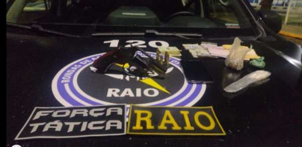 Os policiais militares receberam denúncias sobre um homem que teria uma arma de fogo e estaria traficando drogas naquele bairro. Ao entrar na residência do suspeito, com autorização da moradora, a composição visualizou um indivíduo fugindo pelo quintal, ocasião em que foi impedido pelos policiais. No interior da residência foi encontrado o revólver, drogas e uma quantia em dinheiro.