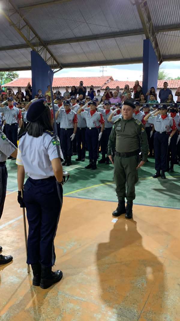 O Coronel Comandante Geral da PMCE, Márcio Oliveira, foi recepcionado pela Guarda de Honra dos alunos, pelo Comandante da Unidade, o Tenente Coronel Eudes Raulino, acompanhado da aluna Coronel, Daiane Sampaio e pela Tenente Coronel Keydna, representando a Coordenadoria dos CPMs. Em quadra, estavam presentes os grupos formados por alunos dos pelotões Especial, Brigadista, Ambiental e de Cerimonial. A banda de música formada por discentes, abrilhantou a cerimônia. Ainda na ocasião, foram homenageados os profissionais destaque do 1º bimestre do ano letivo dentre professores, servidores civis e militares.