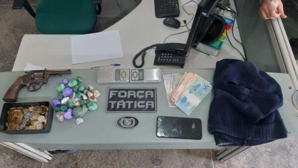Com o acompanhamento tático, a equipe logrou êxito na captura de um dos envolvidos, que tentou se desfazer de uma sacola, que foi apreendida. Após a busca foi encontrado um revólver calibre 38, com 12 munições intactas, duas balaclavas, duas balanças de precisão, uma máquina caça níquel, um celular, entorpecentes, cocaína, crack e maconha e uma quantia no valor de R$ 406,90. De pronto, foi dada a voz de prisão a Benedito Leotério da Silva (45).