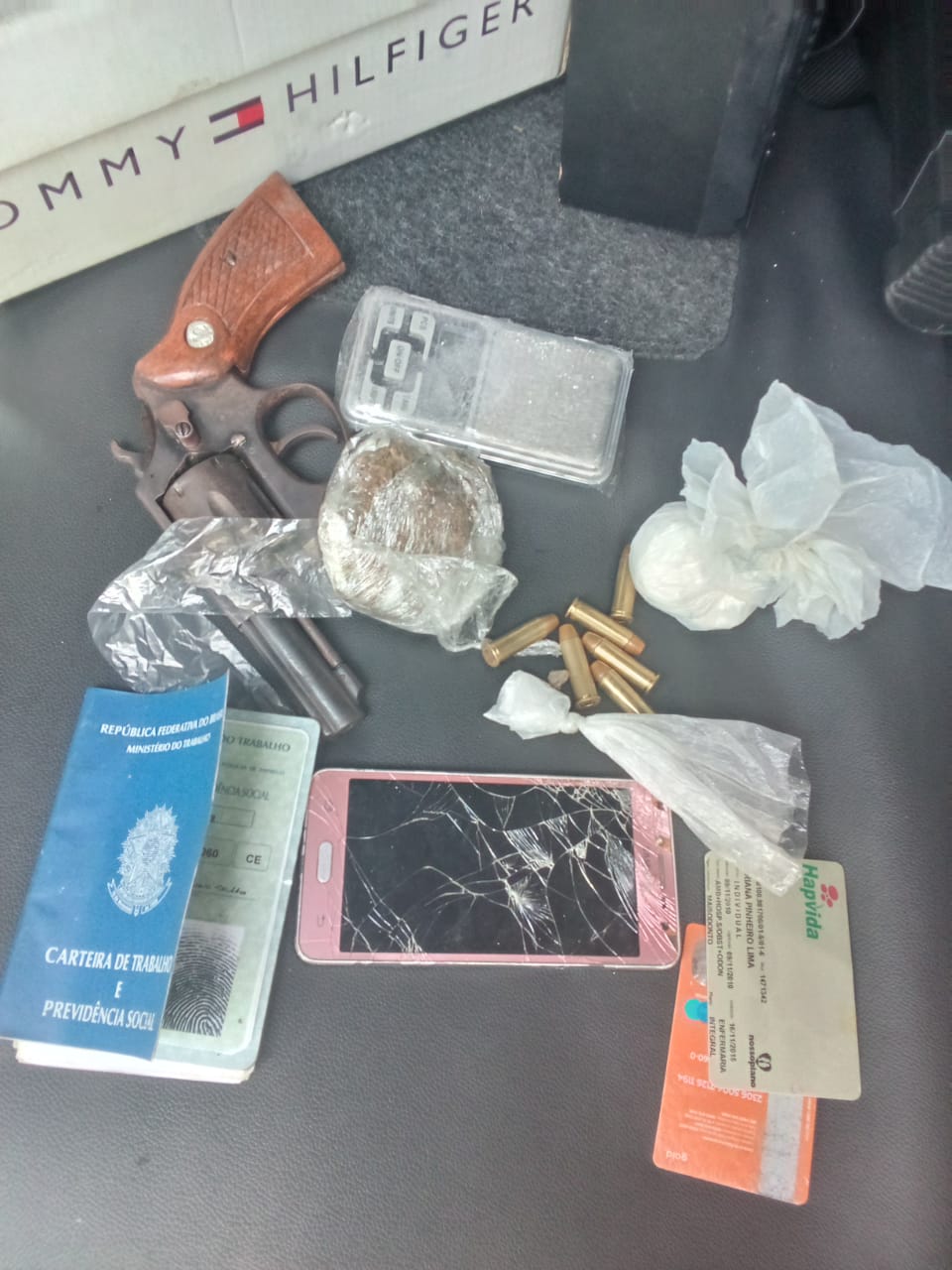 A Polícia Militar do Ceará (PMCE), por meio de uma composição do 5º Batalhão, apreendeu um revólver de calibre .38 com seis munições, porções de cocaína e maconha e inúmeras peças de motocicleta, no bairro Carlito Pamplona, nessa segunda-feira (19). Um suspeito foi preso no decorrer da ocorrência.
