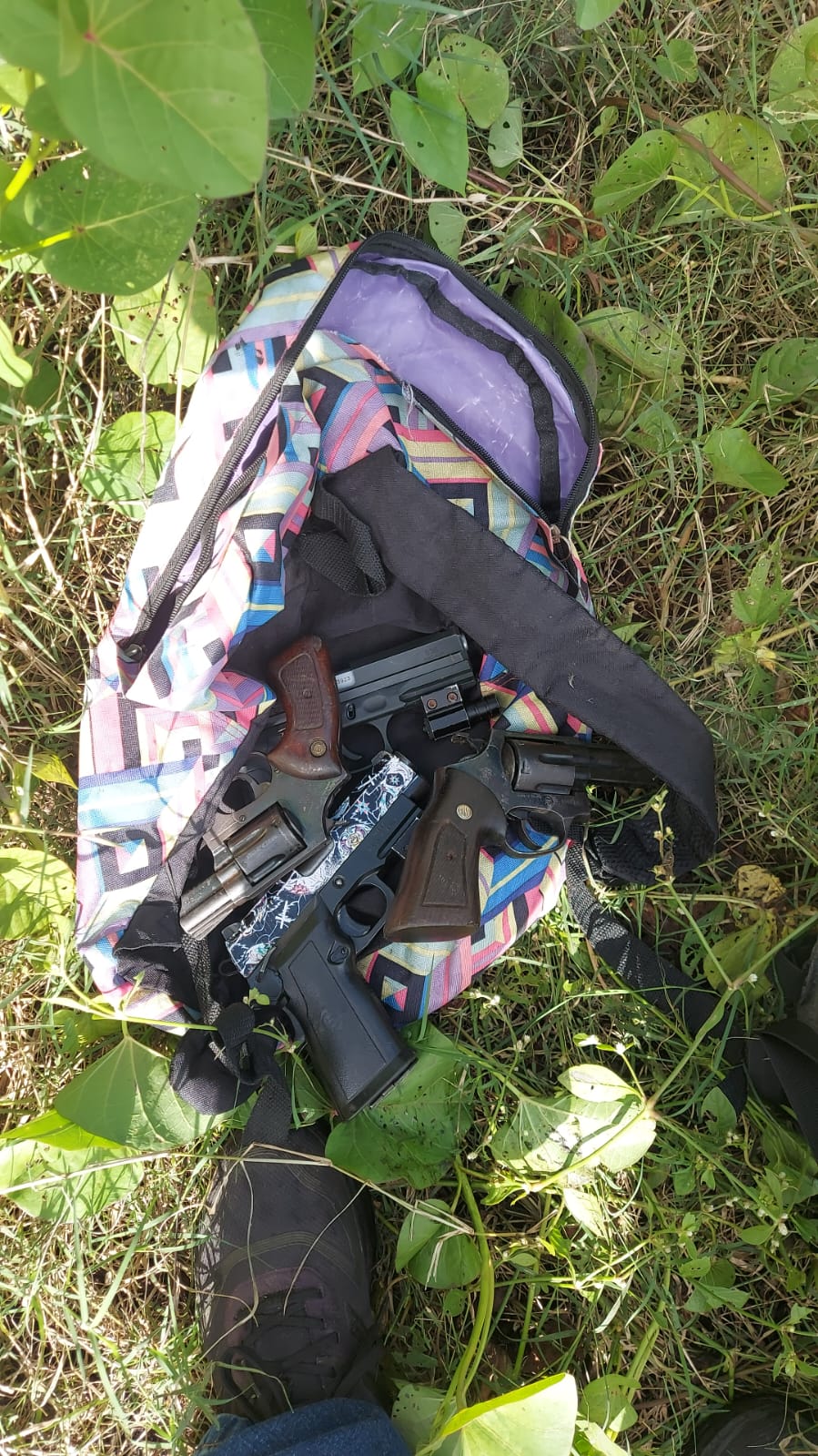 Os policiais militares realizavam patrulhamento na região quando foram informados sobre indivíduos armados em um matagal. Com o apoio do Comando de Policiamento de Rondas de Ações Intensivas e Ostensivas (CPRaio), a equipe do 12º BPM saiu em diligência para identificar os suspeitos. Após fazerem uma busca no local, os militares encontraram dois revólveres e duas pistolas, além de 34 munições de diversos calibres, dentro de duas mochilas.