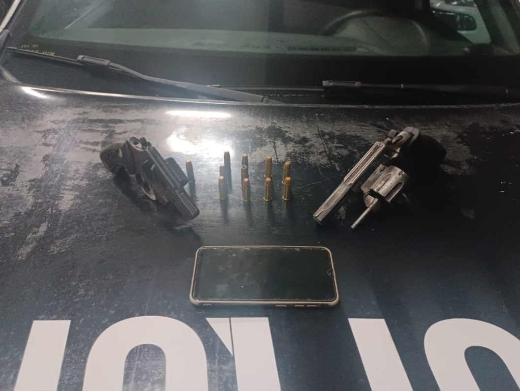 Chegando ao local, os policiais militares abordaram os homens, ambos de 19 anos, os dois estavam com volume suspeito na cintura, na ocasião foi apreendido com eles dois revólveres calibre .38 municiados e um smartphone.