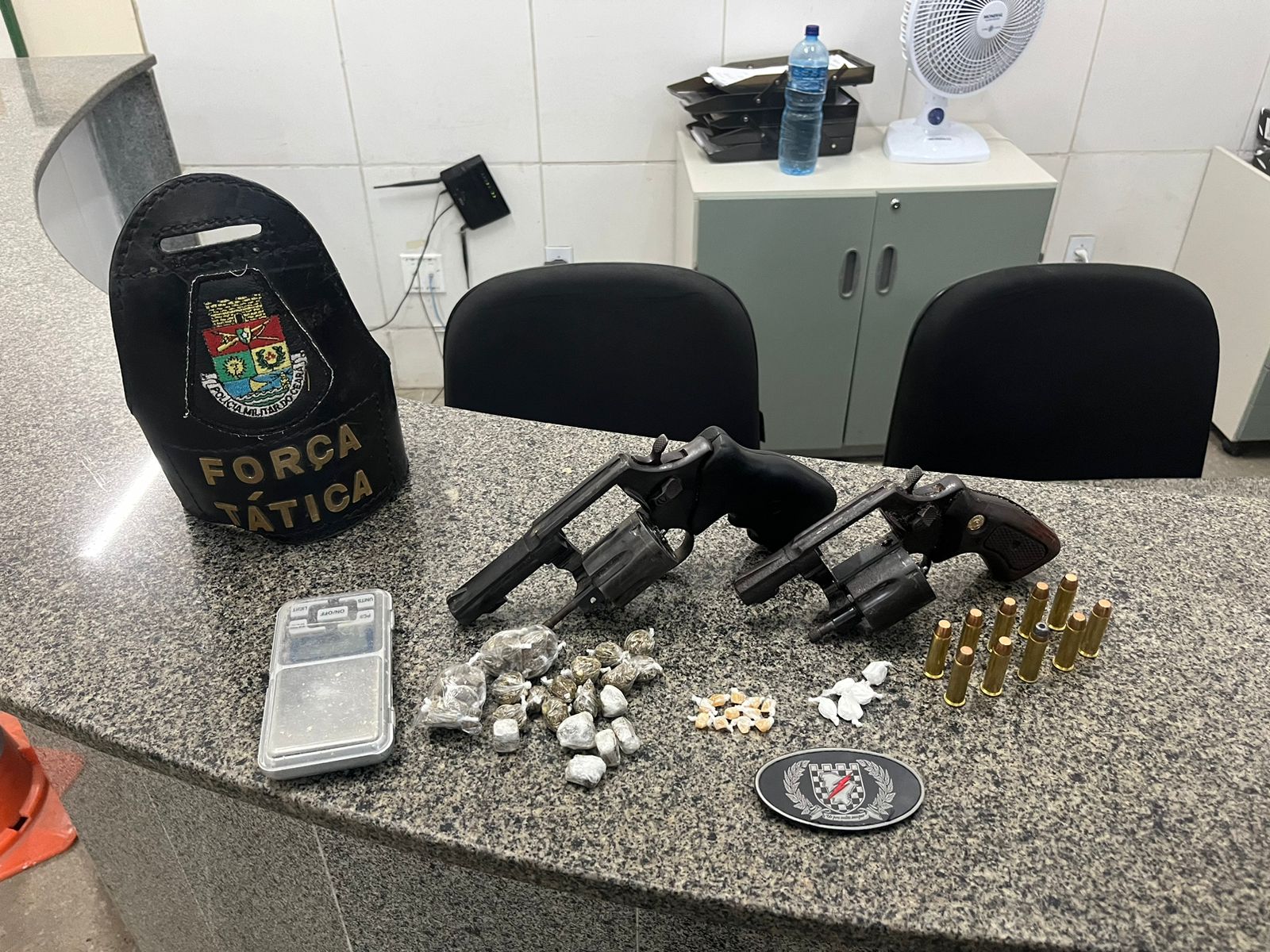 Os suspeitos foram acompanhados e em um cerco ao perímetro foi feito pelos policiais. Os homens de 24 e 20 anos foram capturados e apreendidos, com eles, dois revólveres. Foi apreendido ao todo na ocorrência os dois revólveres, 36 trouxinhas de maconha (24 gramas), 11 pedras de crack (um grama), cinco pinos de cocaína (um grama), uma balança e sacos plásticos.