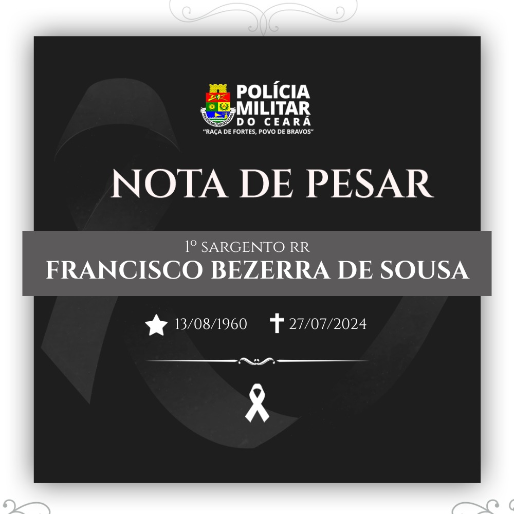 A Polícia Militar do Ceará (PMCE) informa com pesar o falecimento do 1º sargento RR FRANCISCO BEZERRA DE SOUSA, 63.