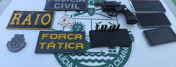 Em Sobral, nessa terça-feira (3), uma equipe da Patrulha Rural e do Comando de Policiamento de Rondas de Ações Intensivas e Ostensivas (CPRAIO) da Polícia Militar do Ceará (PMCE) prendeu dois suspeitos de 20 anos, com quem houve a apreensão de um revólver de calibre .38 com seis munições intactas, uma motocicleta com queixa de roubo e R$ 1.730,00 roubados, em espécie.