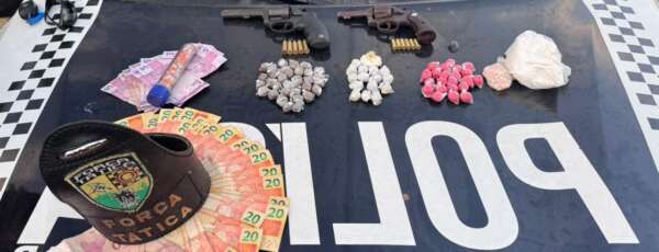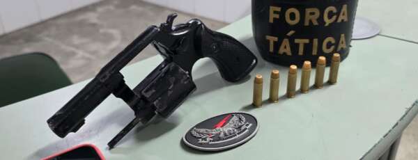 Durante a busca veicular, os agentes localizaram um revólver Taurus calibre .38, com seis munições intactas, além de um bloqueador de sinal “Jammer” com 10 antenas, equipamento frequentemente utilizado em crimes de furto e roubo de veículos.