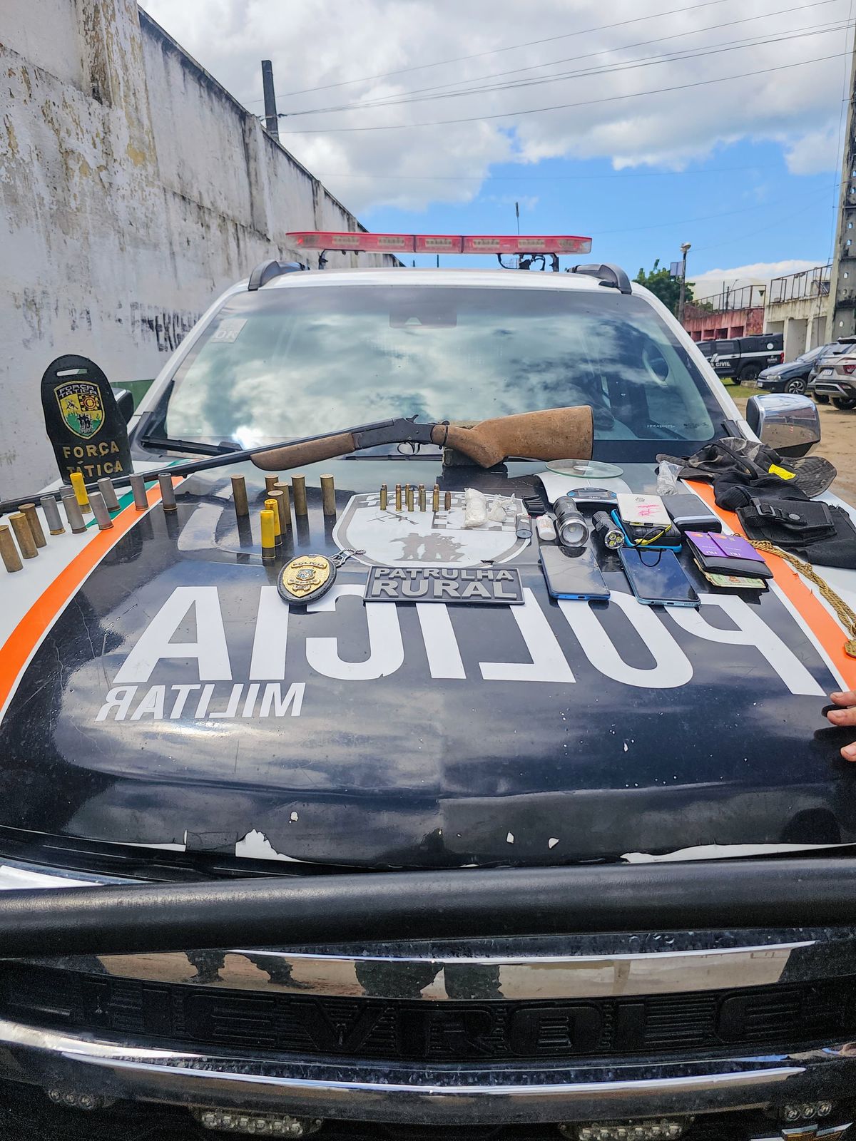 A Polícia Militar do Ceará (PMCE), por meio do 12º Batalhão de Polícia Militar (12º BPM), realizou uma operação, na manhã dessa quinta-feira (3), que resultou na apreensão de armas, drogas e outros materiais ilícitos, além da condução de um adulto e dois adolescentes suspeitos de envolvimento em atividades criminosas. A ação aconteceu no bairro Capuan, em Caucaia.
