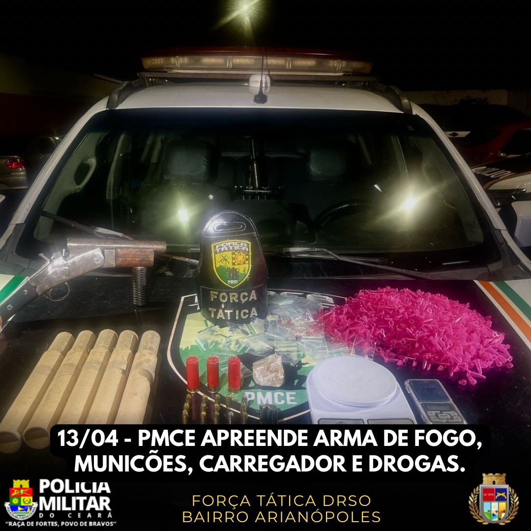 A Polícia Militar do Ceará (PMCE), por meio da Força Tática do 12º Batalhão de Polícia Militar (12ºBPM), apreendeu uma arma de fogo, entorpecentes e munições durante uma ação realizada na noite desse sábado (13), no bairro Nova Metrópole, em Caucaia. A ocorrência foi registrada entre 23h e 1h.