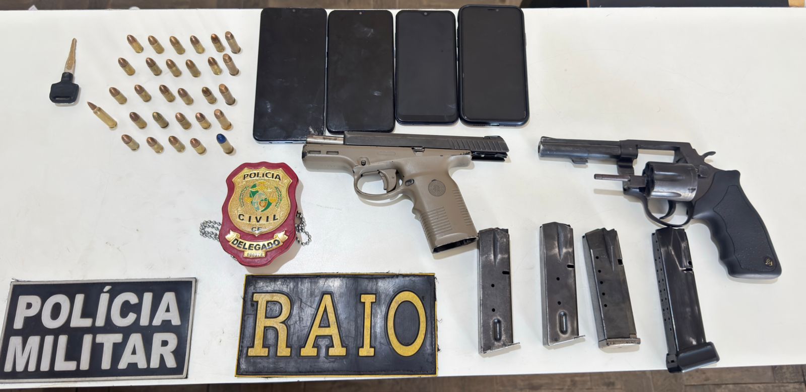 Durante o atendimento da ocorrência, a composição recebeu novas informações apontando que a granada pertenceria a integrantes de um grupo criminoso que estaria escondido em um imóvel no bairro Boaviaginha. As diligências foram intensificadas e, ao chegar ao endereço indicado, os policiais abordaram quatro pessoas. Com o grupo, foram apreendidas duas armas de fogo: uma pistola calibre .40 e um revólver calibre .38.
