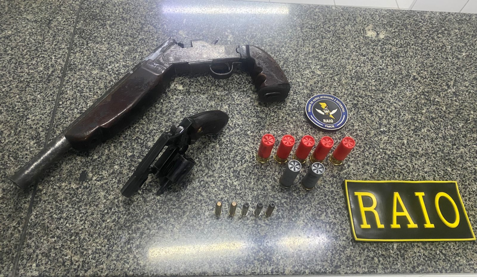 No total, foram apreendidos uma espingarda artesanal calibre 12, um revólver calibre .32, sete munições calibre 12 e cinco munições calibre .38.