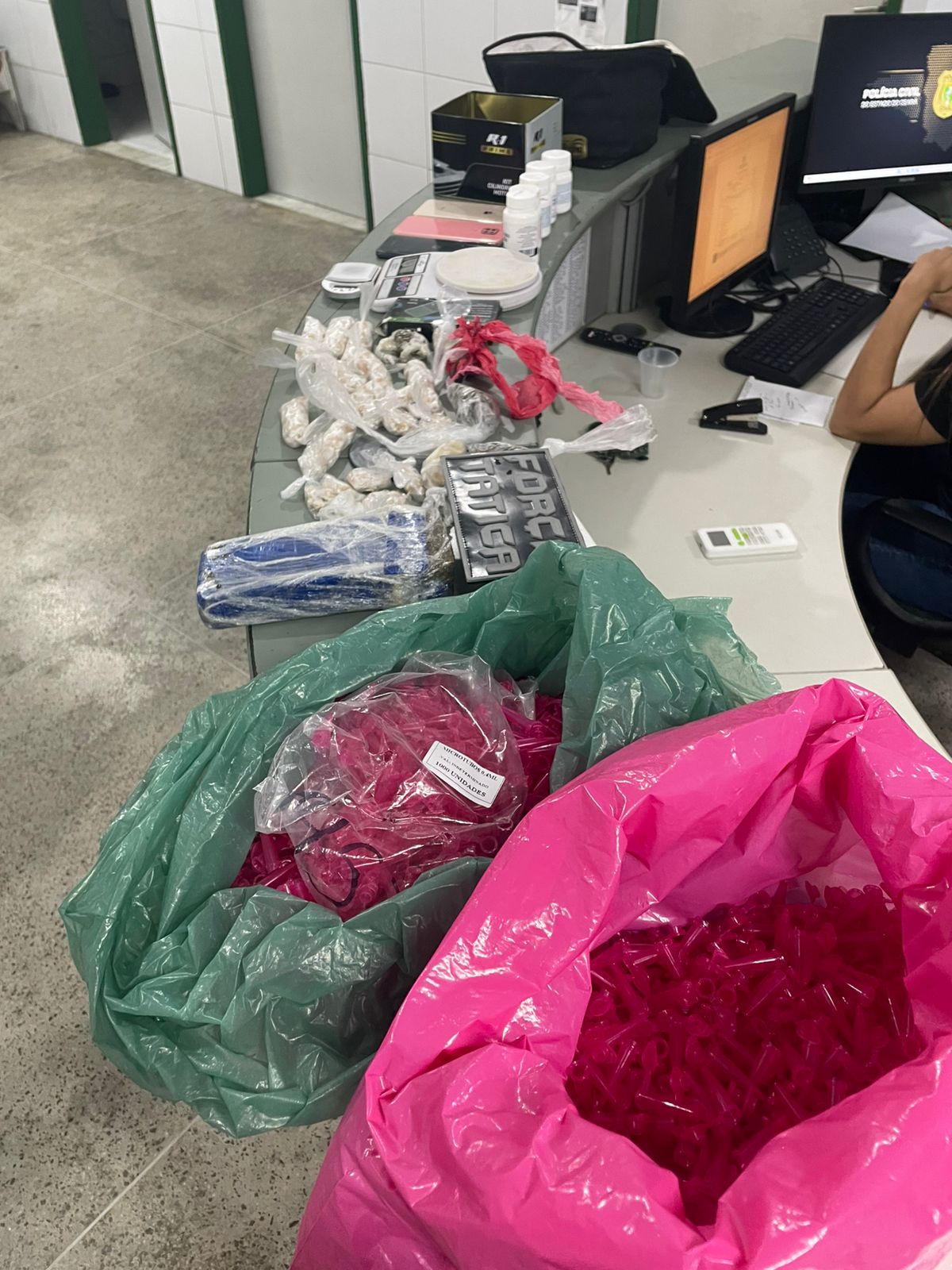 Durante a averiguação no imóvel, os policiais encontraram, aproximadamente, 450 gramas de maconha, 90 gramas de crack e 3 gramas de cocaína. Também foram apreendidas três balanças de precisão, três aparelhos celulares e dois potes contendo bicarbonato de sódio.