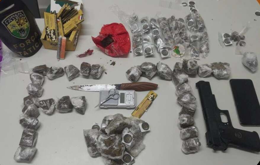 Ao ser questionado, o jovem afirmou que comercializava drogas na região e que havia mais material ilícito em sua residência, nas proximidades. Com autorização da responsável pelo imóvel, os policiais realizaram buscas no quarto do adolescente, onde localizaram uma bolsa contendo mais drogas, uma balança de precisão, um simulacro de pistola, uma faca, papel seda, saquinhos e um caderno com anotações relacionadas ao tráfico.