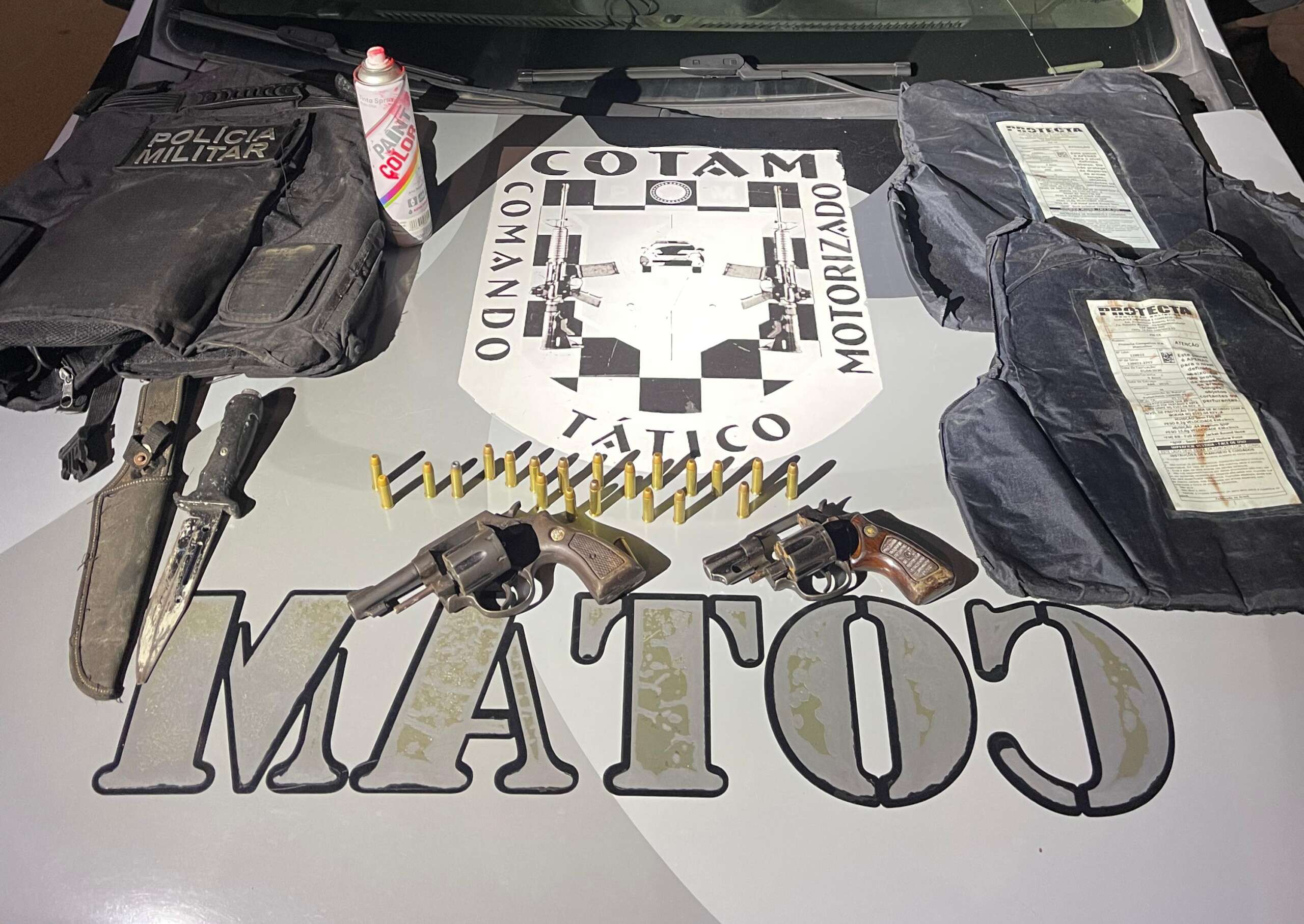 Ainda, durante as buscas, na residência em que os suspeitos tentou se esconder, os policiais encontraram um colete balístico da PMCE, uma faca e uma lata de spray vermelho.