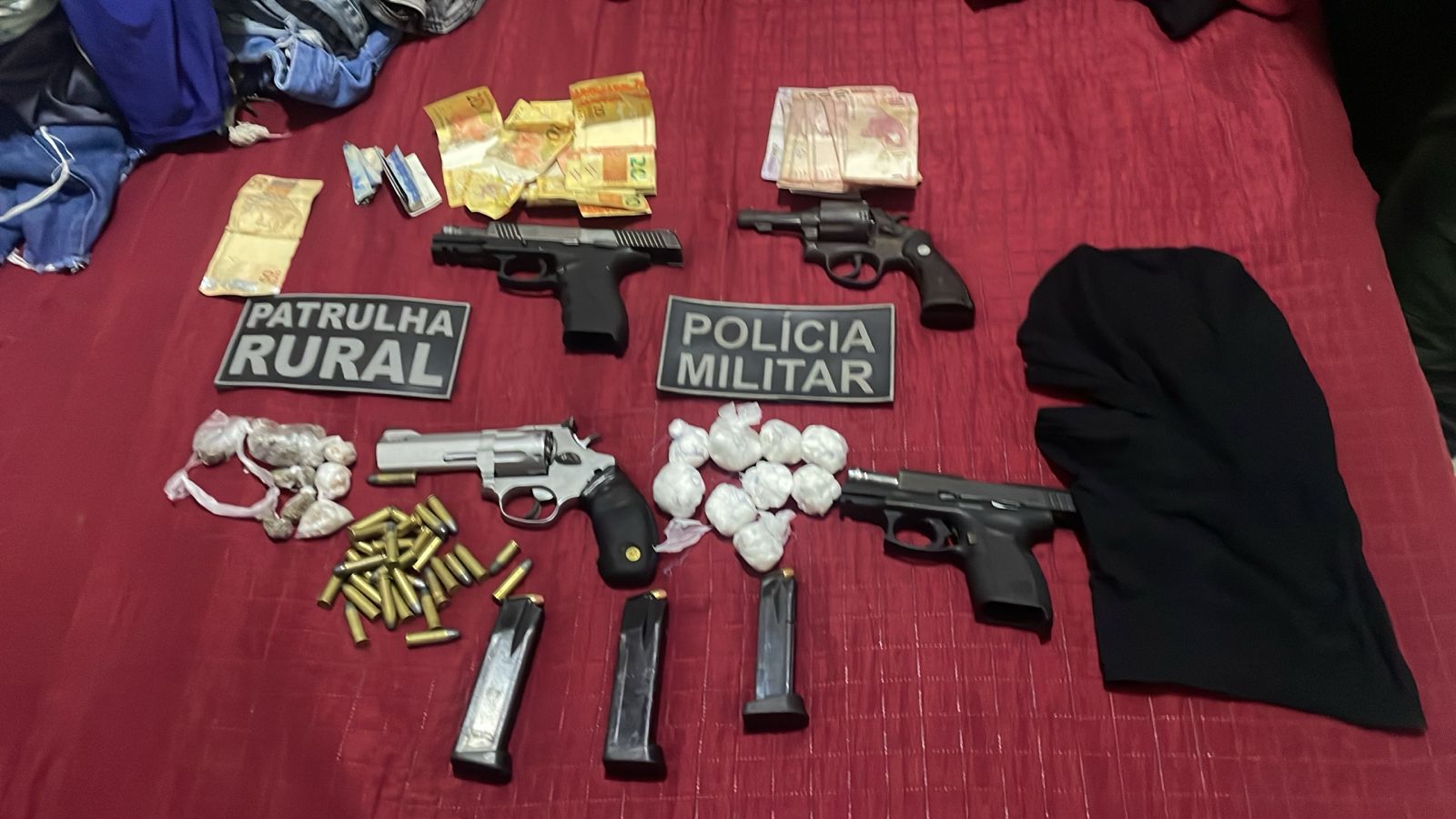 No interior do imóvel, sete pessoas foram encontradas, sendo três maiores e quatro adolescentes. Durante as buscas, foram localizadas duas pistolas – uma PT 840 e uma PT 380, ambas com numeração suprimida –, dois revólveres (um calibre .357 e um calibre .38), quatro carregadores e 18 munições de calibre .38. Também foram apreendidos entorpecentes, entre eles maconha e cocaína.