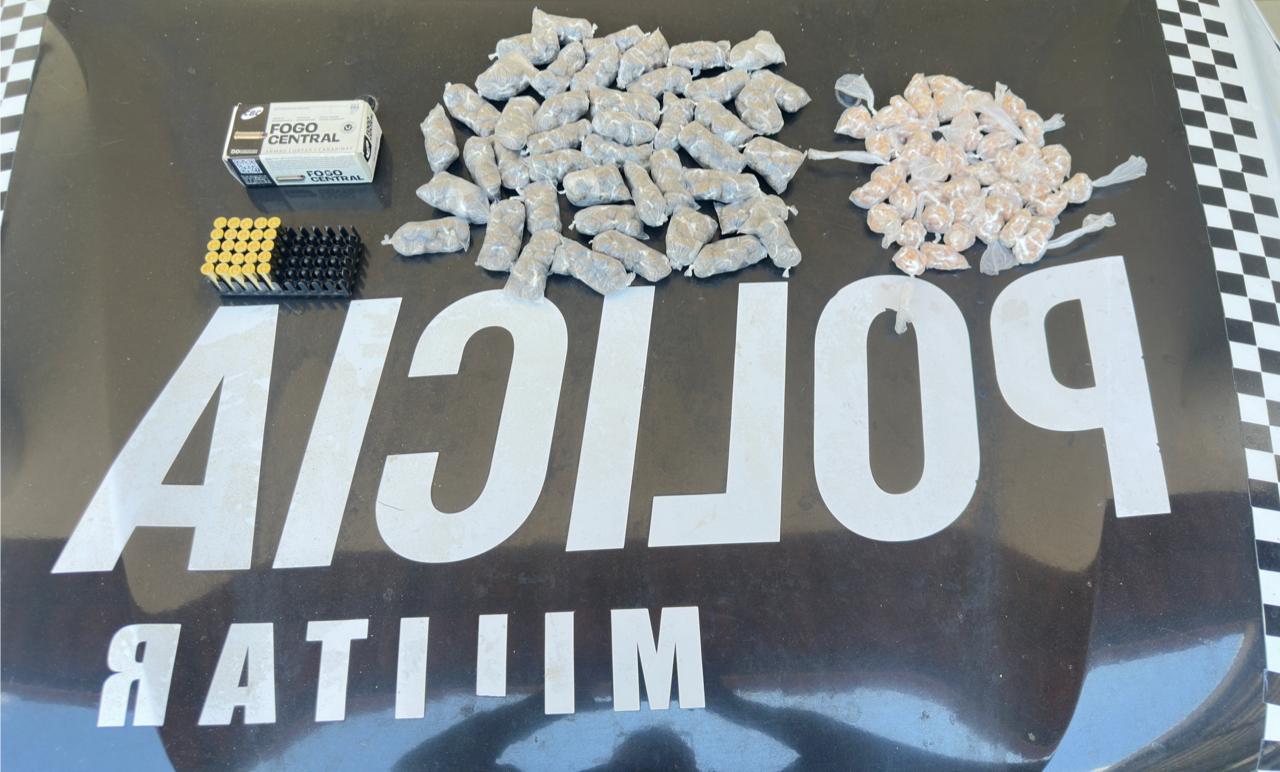 Durante a abordagem, o morador do imóvel permitiu a entrada dos policiais e afirmou que não tinha drogas na residência. No entanto, ao realizarem buscas no quintal, as equipes encontraram uma caixa de munições vazia. Questionado, o morador confessou que havia enterrado as munições e que os entorpecentes estariam em outra casa, no bairro Boa Vista, sob a guarda de um comparsa, também envolvido na ação criminosa.