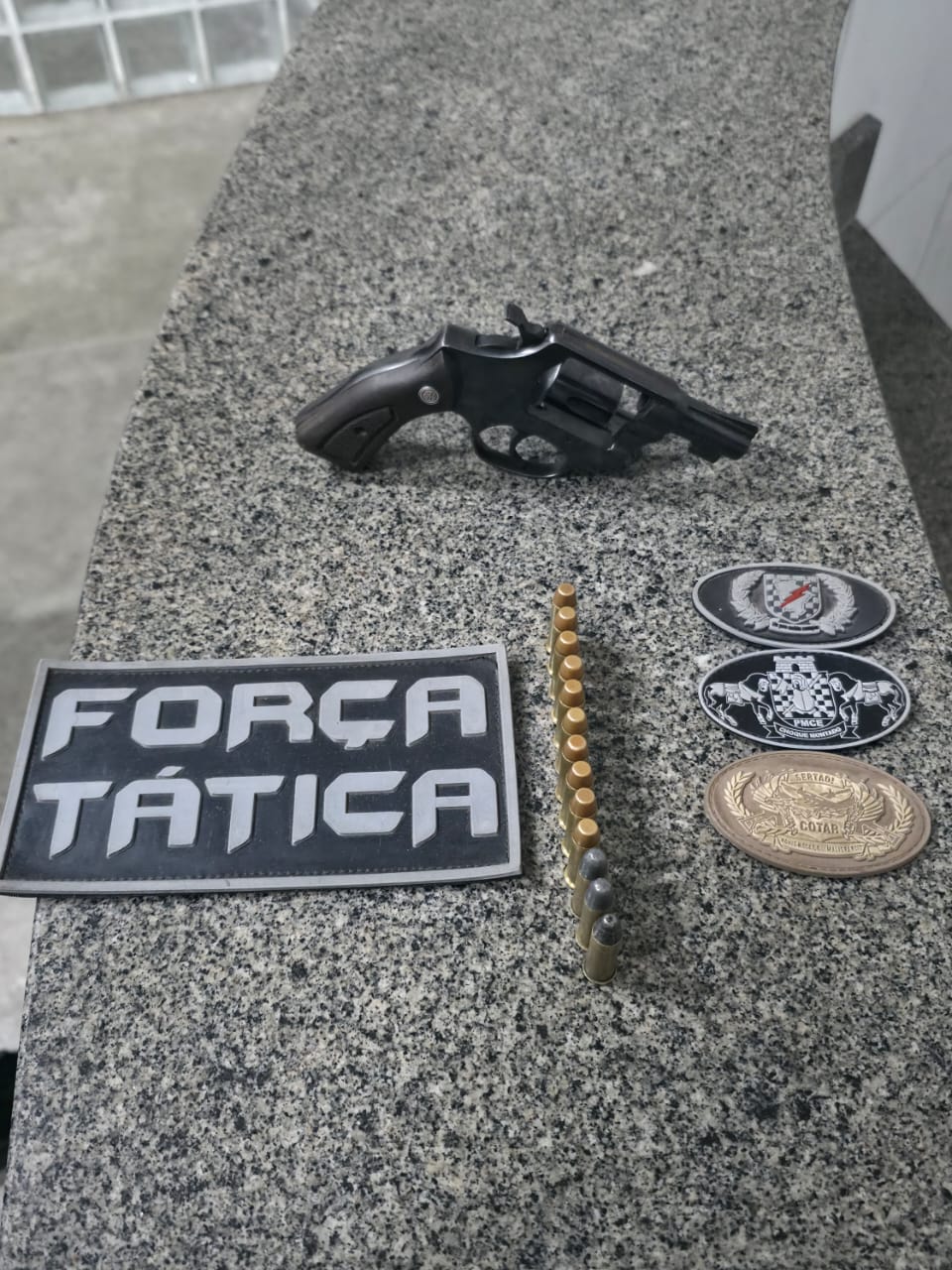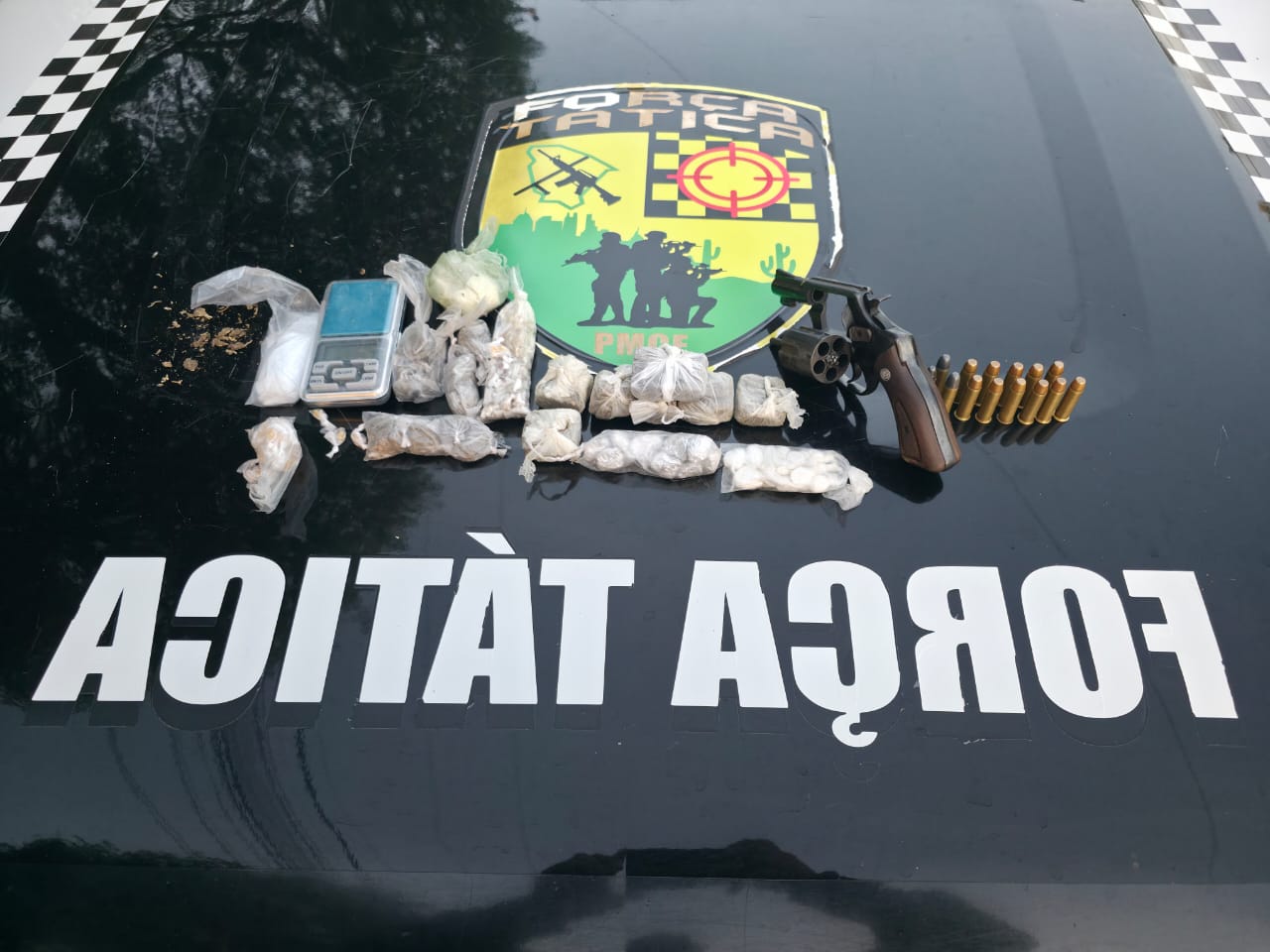 Durante a abordagem, foram presos os homens com idades de 21, 20 e 18 anos, e apreendidos um revólver calibre .38 com 14 munições, além de 36 gramas de cocaína, 121 gramas de maconha e 16 gramas de crack.
