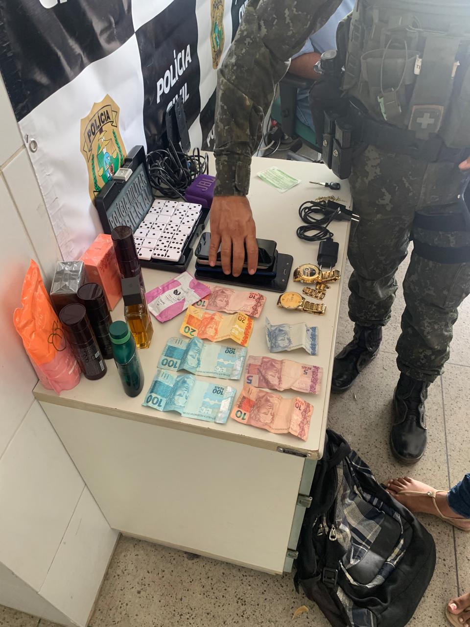 Entre os materiais recuperados estão um tablet, três celulares, R$ 247 em espécie, dois relógios, dois carregadores de celular, uma corrente banhada a ouro, uma caixa de som JBL, um jogo de dominó e sete frascos de perfume.