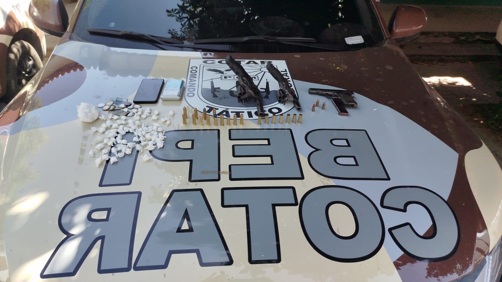 No interior do imóvel, as equipes apreenderam três armas de fogo, sendo dois revólveres calibre .38 e uma pistola calibre 7,65, além de 139 gramas de substância análoga à cocaína, já embalada e pronta para comercialização. Também foram encontradas 24 munições de calibres variados, duas motocicletas com queixa de roubo e diversos objetos, como uma balança de precisão e dois aparelhos celulares.