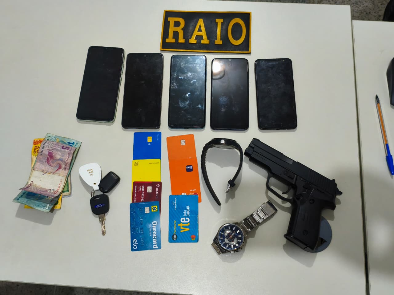 Diante das informações, a equipe policial iniciou diligências e conseguiu localizar e abordar o veículo na Avenida Washington Soares. Durante a vistoria, foram encontrados cinco aparelhos celulares, oito cartões de crédito pertencentes às vítimas, R$ 125,00 em espécie e um simulacro de pistola utilizado na prática dos crimes.