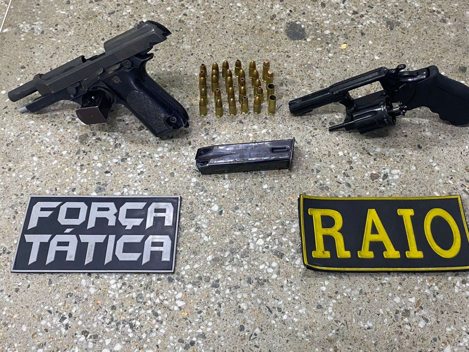Durante a fuga, os suspeitos deixaram pelo caminho uma pistola Beretta PT92 calibre 9mm, um revólver calibre .38, 27 munições de diversos calibres, três capacetes e uma motocicleta Honda Bros de cor preta, com queixa de roubo e, também, utilizada na ação criminosa.