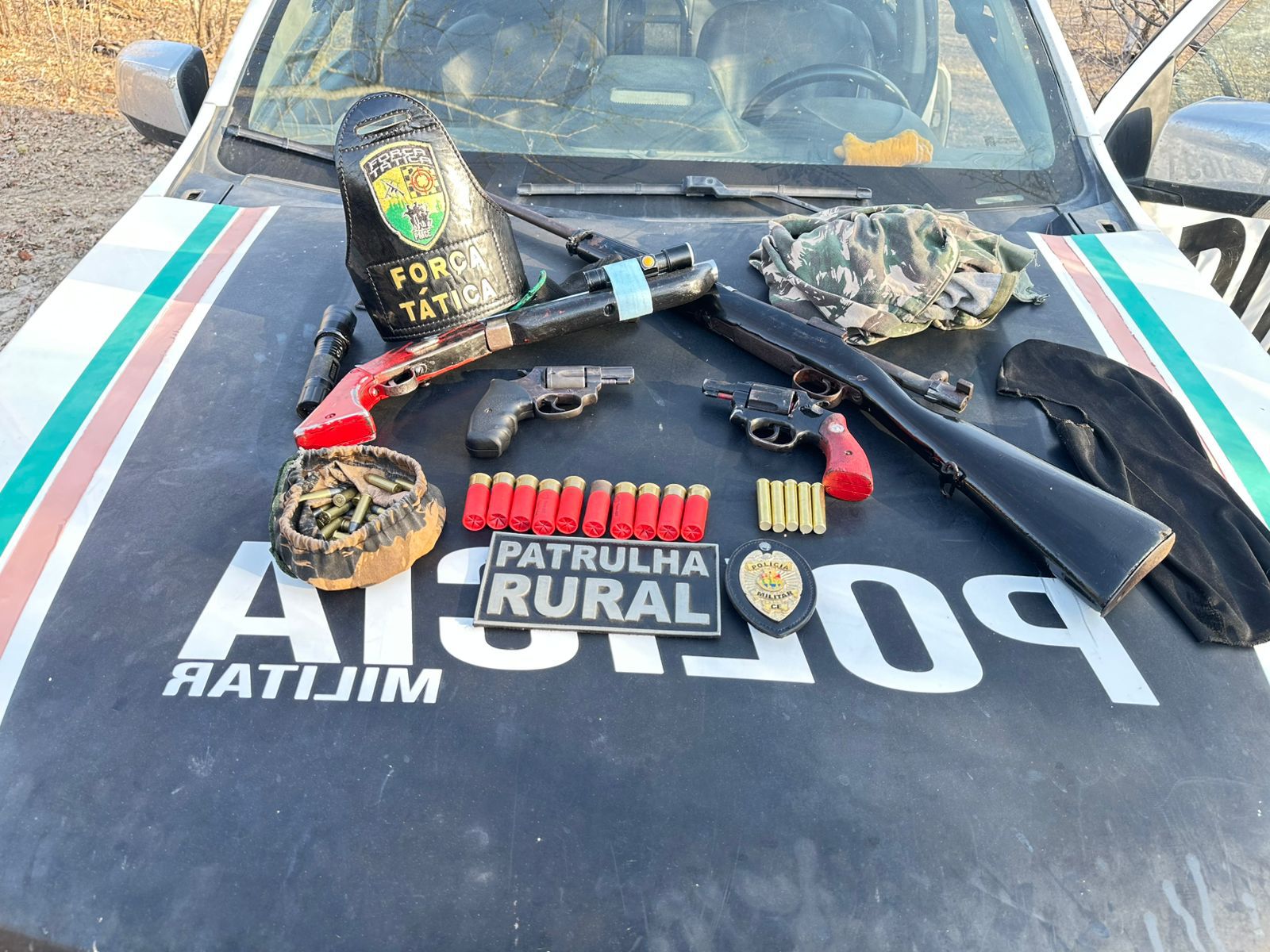 A Polícia Militar do Ceará (PMCE), por meio do 11º Batalhão de Polícia Militar (11º BPM), apreendeu uma dupla de adolescentes com duas armas de fogo longas e dois revólveres calibre .38, munições de diversos calibres e vestimentas camufladas, na tarde dessa quarta-feira (29), no município de Amontada. A ação envolveu equipes da Patrulha Rural, Força Tática, e a Subagência de Inteligência do Batalhão.