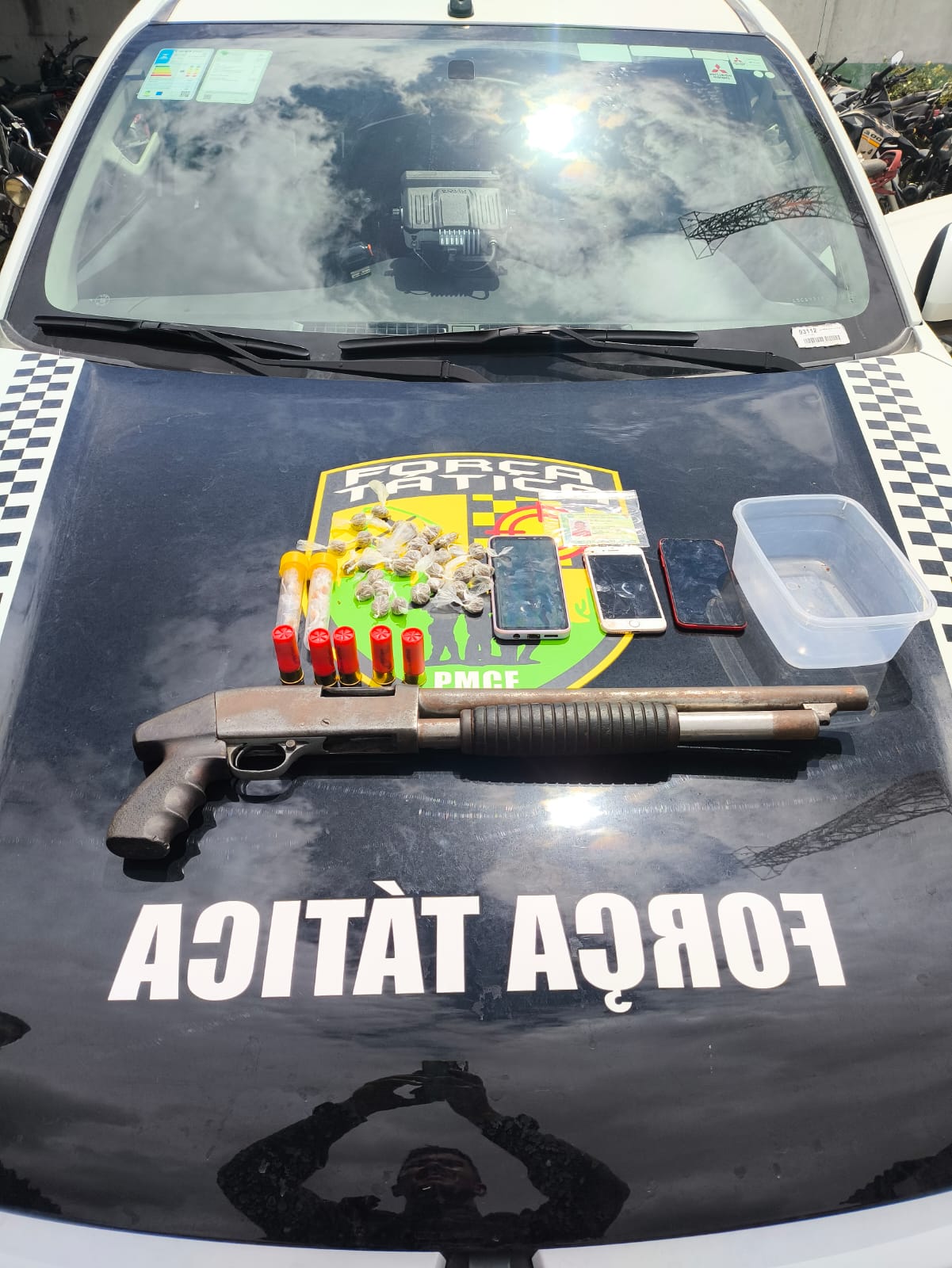 Durante a operação, foram apreendidos uma espingarda calibre 12, cinco munições do mesmo calibre, 32 trouxinhas de maconha totalizando 28,2 gramas e 31 pedras de crack com 6,3 gramas. Os suspeitos foram conduzidos à Delegacia Metropolitana de Maranguape, onde foram autuados pelos crimes de tráfico de drogas, posse ou porte ilegal de arma de fogo e por integrar organização criminosa.