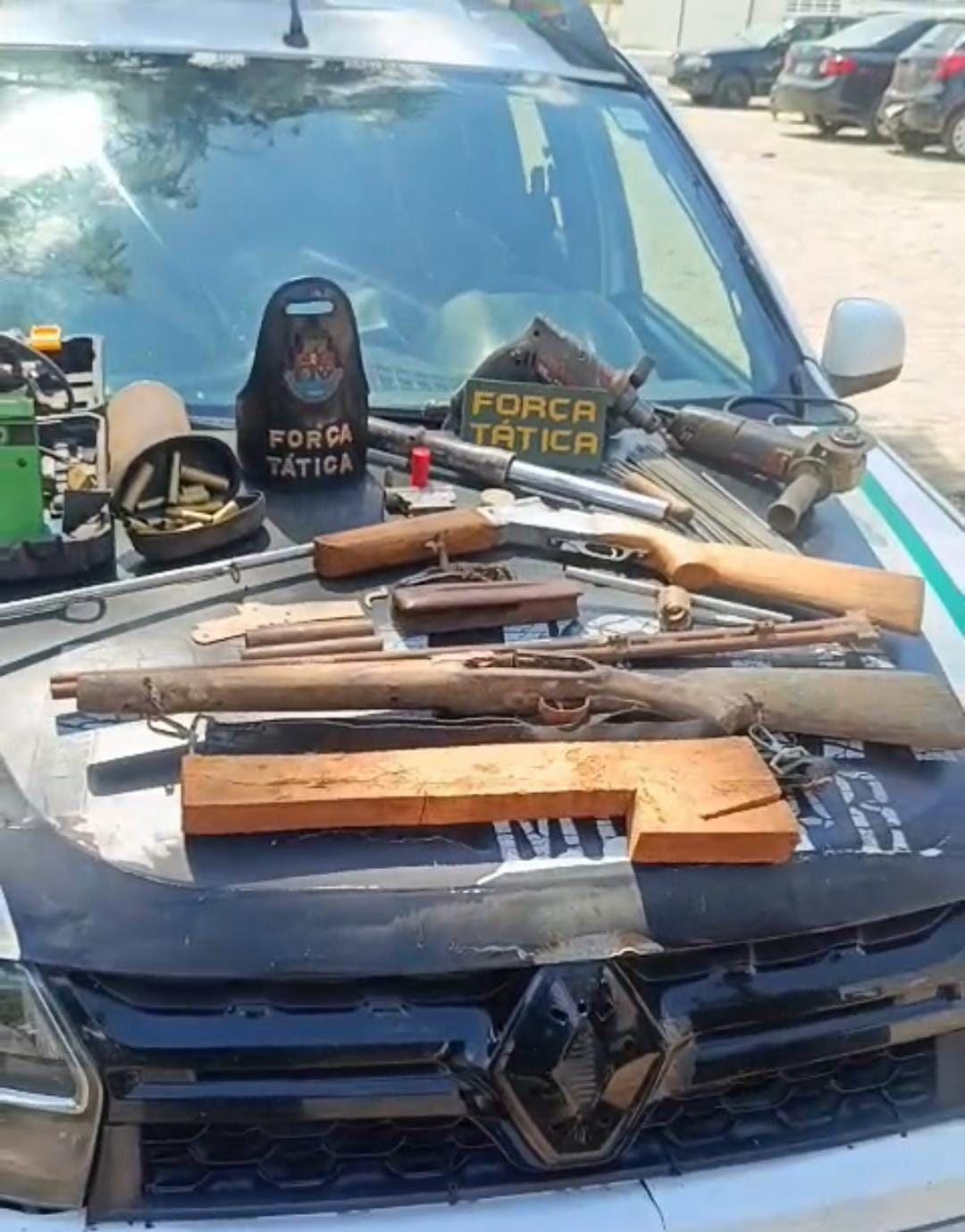 Os policiais receberam informações de que uma residência, localizada na Avenida Dr. Antônio Correia Saraiva, no bairro Bela Vista, funcionava como oficina ilegal de armamentos. No endereço, a equipe realizou o cerco e o suspeito ainda tentou fugir pelos fundos, mas foi rapidamente contido. Durante a abordagem, ele admitiu que havia uma arma dentro da casa e autorizou a entrada dos policiais. No interior do imóvel, foi localizada uma espingarda calibre .40, além de um vasto conjunto de itens utilizados na fabricação e manutenção de armas de fogo.