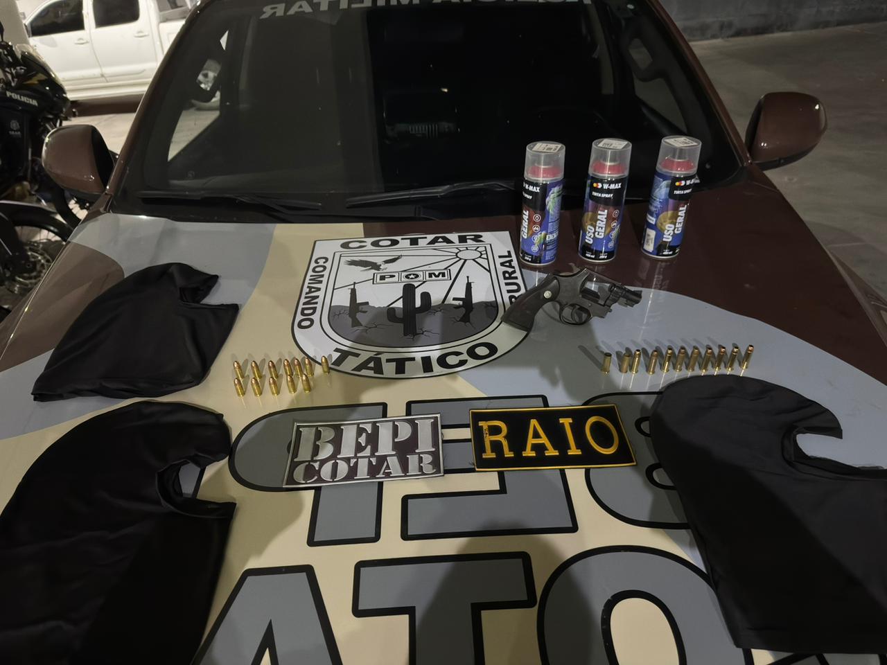 Na área da ocorrência, os policiais encontraram e apreenderam um revólver calibre .38 com munições intactas e deflagradas, além de munições de calibre 9mm. Também foram recolhidos três balaclavas, três frascos de spray vermelho e uma motocicleta modelo Bros, com registro de roubo.