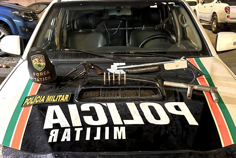 Durante o policiamento ostensivo na área, os policiais realizaram incursões em um terreno abandonado, apontado por denúncias como ponto de movimentação de indivíduos ligados a grupos criminosos. Ao inspecionar o local, os militares encontraram uma sacola contendo duas espingardas artesanais calibre 12 e um revólver calibre .38, possivelmente abandonadas com a aproximação das equipes.