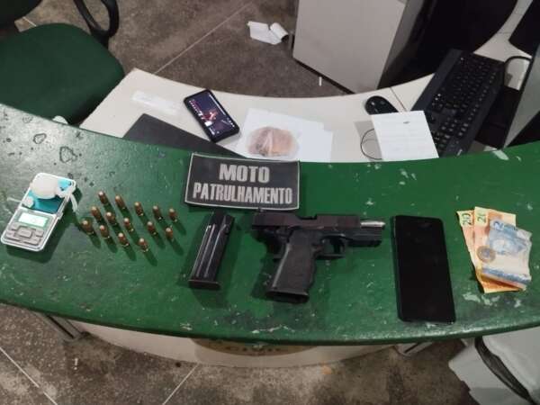 A equipe de motopatrulhamento realizava ações ostensivas na via quando visualizou um indivíduo em atitude suspeita. Ao perceber a aproximação policial, o homem tentou se desfazer de uma arma de fogo, arremessando-a sobre um telhado. Em seguida, ele se deitou ao solo e se rendeu. Durante a abordagem, os agentes encontraram porções de cocaína, uma balança de precisão, R$ 43 e um aparelho celular. Após buscas no local, a arma também foi localizada no referido telhado.