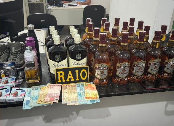 Com eles, foram apreendidos R$ 1.100,00 em espécie, 24 garrafas de whisky, além de produtos diversos, incluindo protetores labiais, recarga de lâminas, um par de tênis, uma garrafa d’água, duas mochilas e um celular. O veículo utilizado pela dupla também foi apreendido.