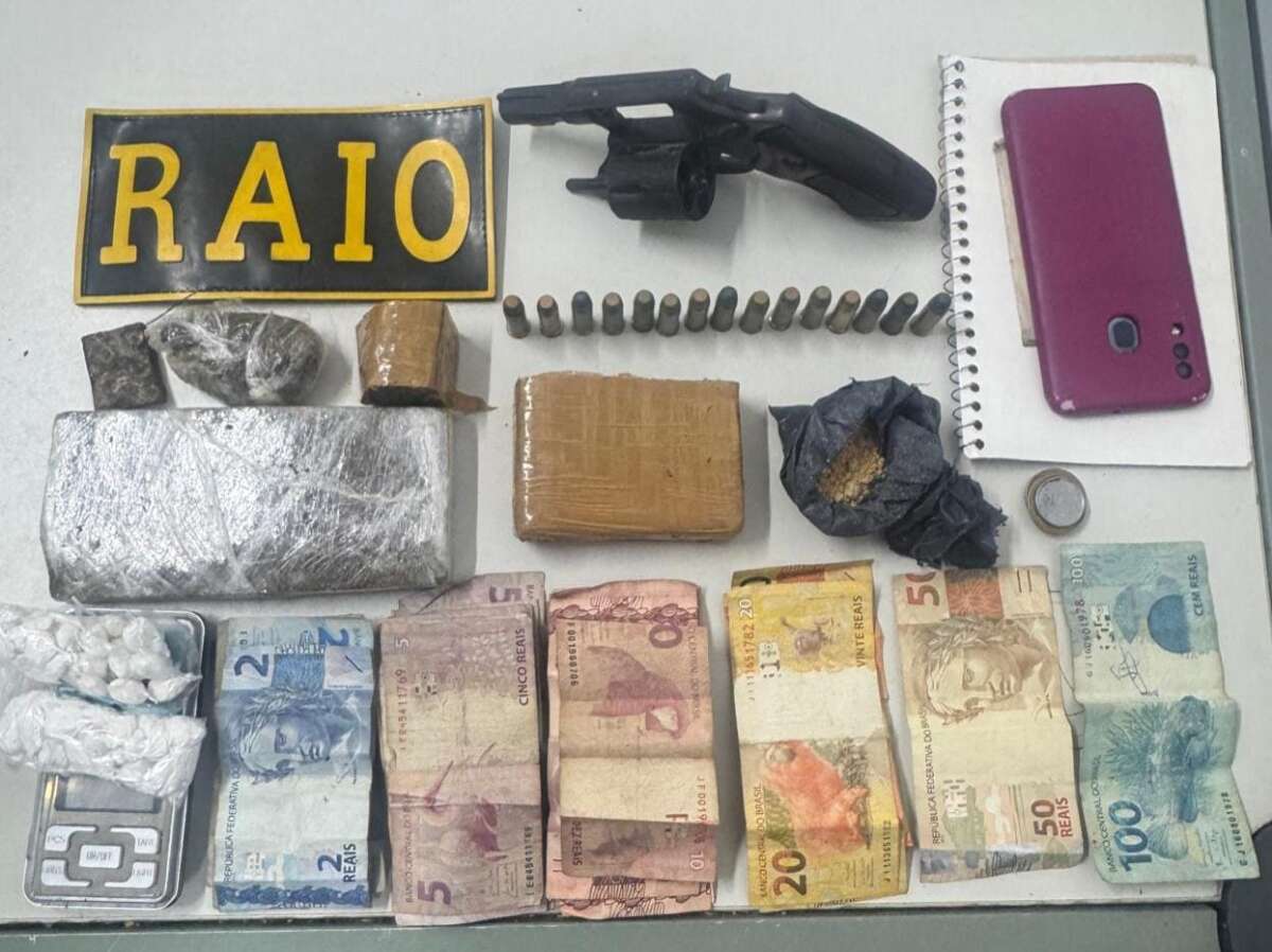 Durante a abordagem, foram apreendidos um revólver calibre .38 com 15 munições, R$ 444 em espécie e aproximadamente 543 gramas de drogas, entre cocaína, maconha e crack.
