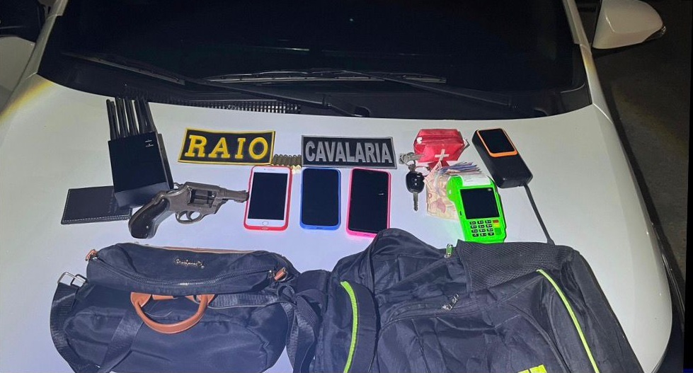 Equipes do Comando de Policiamento de Rondas de Ações Intensivas e Ostensivas (CPRaio) e do Regimento de Polícia Montada (RPMont) da Polícia Militar do Ceará (PMCE) recuperaram, na noite dessa quarta-feira (26), um carro roubado e apreenderam um revólver calibre .38 com munições, um aparelho bloqueador de sinal (jammer), pequenas quantidades de maconha, R$ 170 em espécie, dois celulares e outros materiais, durante uma ação ocorrida na BR-116, em Itaitinga. Dois homens, ambos de 19 anos, foram presos.