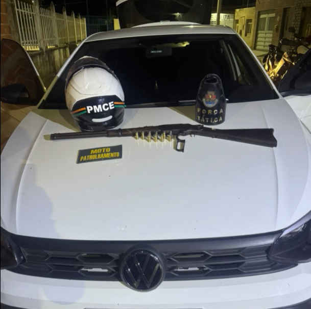 A Polícia Militar do Ceará (PMCE), por meio da 1ª Companhia do 2º Batalhão (1ª Cia/2º BPM), subordinada ao 4º Comando Regional de Polícia Militar (4º CRPM), prendeu em flagrante um homem de 26 anos por roubo de veículo e porte ilegal de arma de fogo de uso restrito. A ação ocorreu na noite dessa quarta-feira (26), no bairro Pedrinhas, em Juazeiro do Norte.