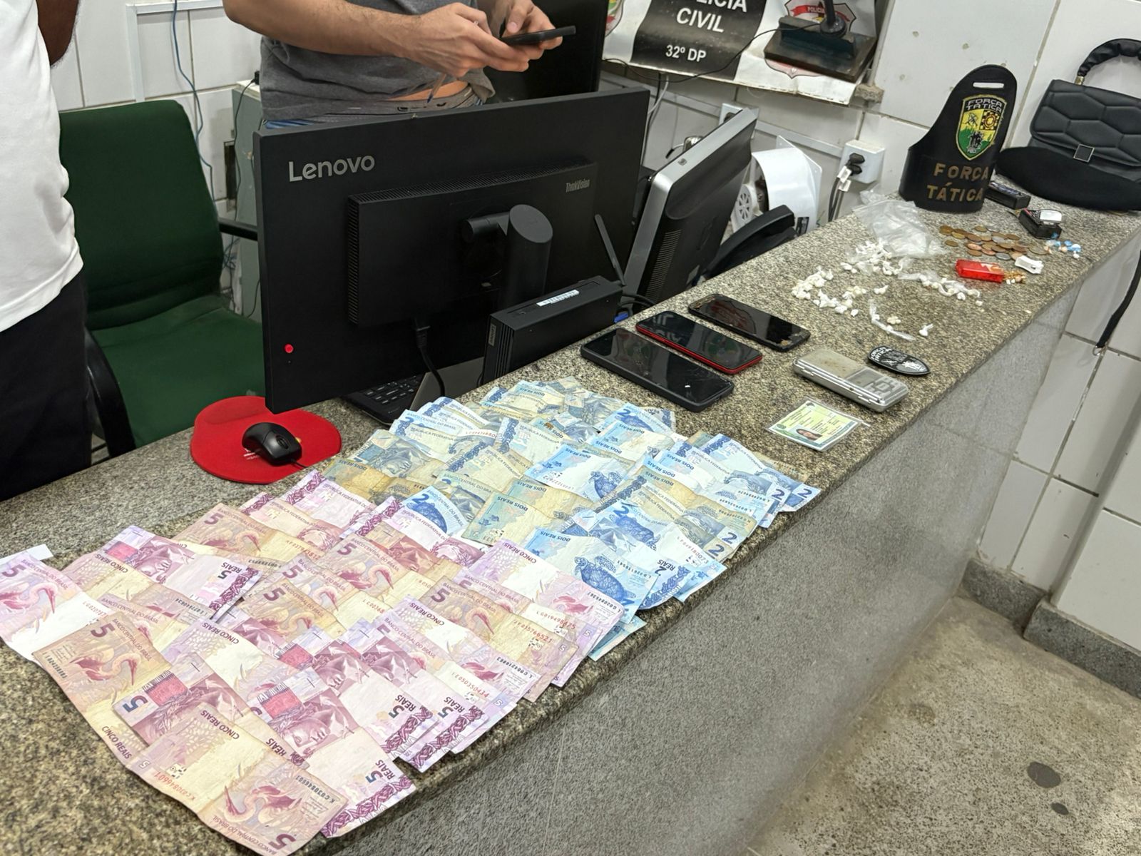 No interior do imóvel, foram encontrados 23 gramas de crack e 90 pinos contendo a mesma substância, além de R$ 235,00 em espécie, uma balança de precisão e cerca de 50 embalagens plásticas comumente utilizadas para fracionamento de entorpecentes.