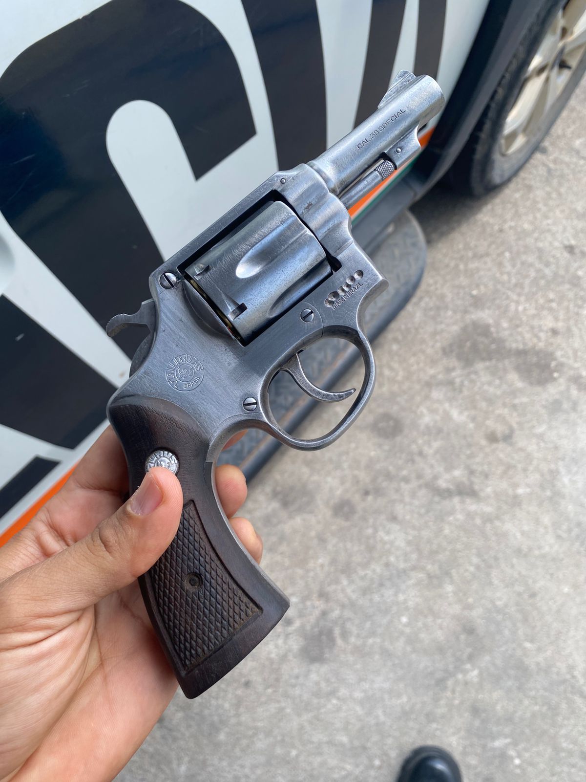 No local, os policiais militares identificaram o homem dentro da loja de conveniência e realizaram a abordagem quando ele saiu do banheiro. Com ele, foi encontrado um revólver calibre .38, contendo munições intactas e deflagradas, além de numeração suprimida.