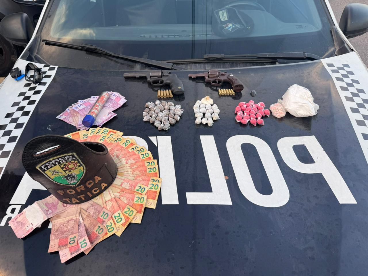 Durante a ofensiva, as equipes realizaram diversas abordagens e buscas minuciosas nas quadras da localidade. Em uma dessas áreas, os policiais identificaram uma estrutura utilizada como esconderijo, conhecida como “toca”, onde foi localizado o material ilícito. No local foram apreendidos um revólver calibre 32 e um revólver calibre 38. Também foram encontradas seis munições de calibre 32 e cinco de calibre 38, além de 147 gramas de maconha fracionada em trouxinhas, 23 gramas de crack, 246 gramas de cocaína e a quantia de R$ 770,00 em dinheiro.