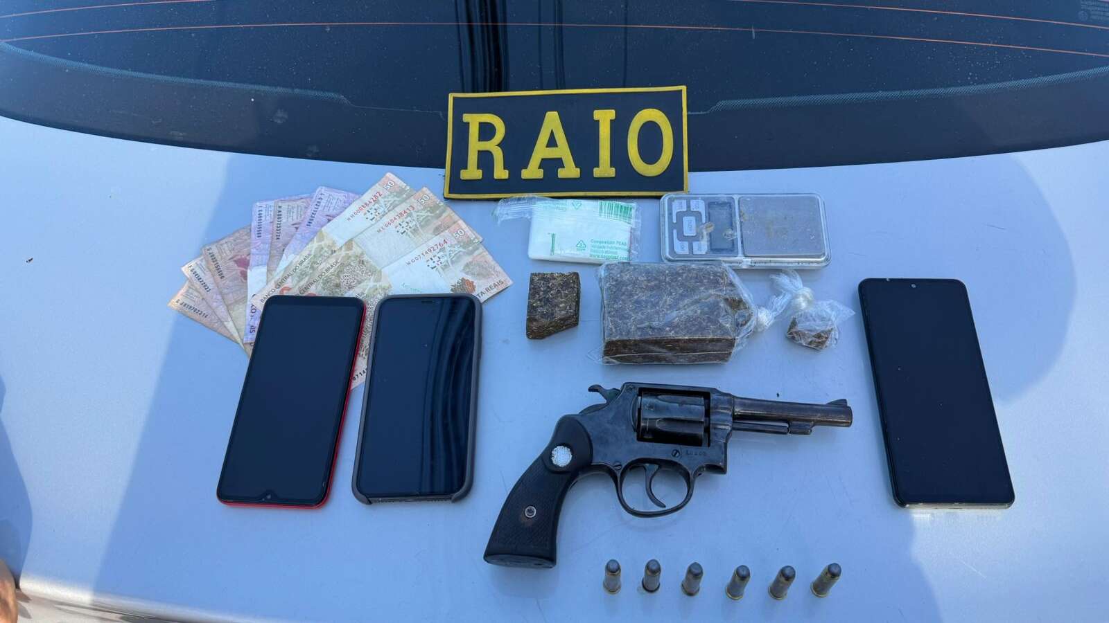 Durante patrulhamento, a equipe identificou a dupla em uma motocicleta em alta velocidade e com atitude suspeita. Na abordagem, foram encontrados com a garupeira um revólver calibre .38, seis munições e dois celulares em uma sacola.
