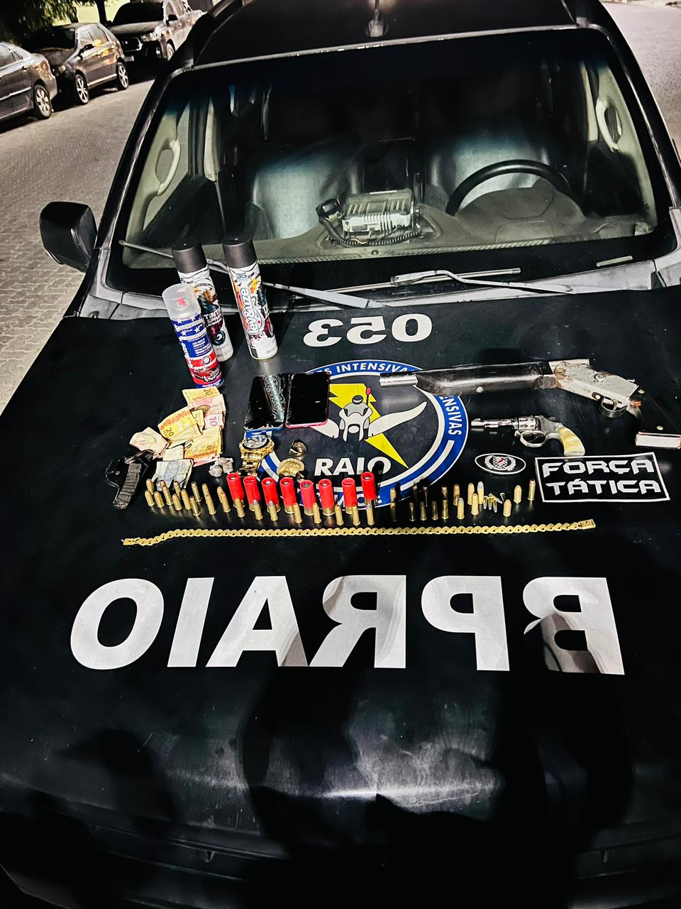 Durante a abordagem, os ocupantes da residência se apresentaram e assumiram a posse de dois armamentos – um revólver calibre .22 e uma espingarda calibre 12 –, além de entorpecentes e diversas munições. Foram apreendidos 13 trouxas de maconha, totalizando 14 gramas, 30 munições intactas de calibre 38, seis de calibre .40, 18 de calibre .22 e oito de calibre 12. A composição também localizou R$ 243,00 em espécie, dois aparelhos celulares, três tubos de tinta spray, joias e acessórios.