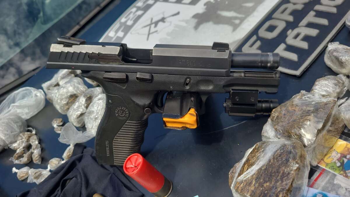Ao perceber a aproximação das equipes, o suspeito tentou se desfazer do material, arremessando uma sacola e uma mochila em sentidos opostos. Após buscas, os policiais localizaram os objetos e constataram que a sacola continha 400 gramas de cocaína, enquanto a mochila armazenava 1,5 kg de maconha,, uma pistola calibre .40, além de munições de calibres .38, .40 e 12. Também foram recolhidos R$ 451 em espécie e outros materiais utilizados no tráfico de drogas.