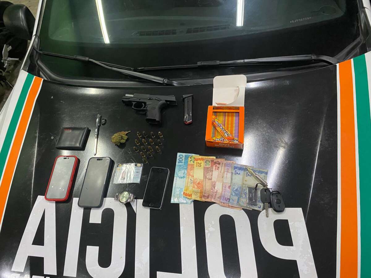 Durante a busca pessoal, foi apreendida uma pistola calibre .380 com 15 munições, drogas (maconha, crack e êxtase), além de R$ 198 em espécie.