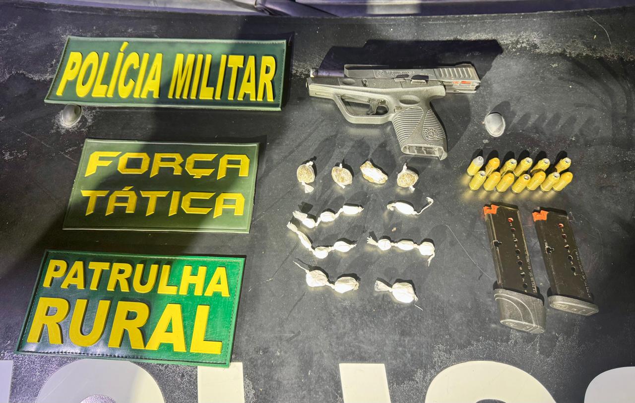 Durante as buscas, os policiais localizaram uma pistola .40, dois carregadores, 13 munições, 13 papelotes de cocaína, quatro trouxas de maconha e R$ 50 em espécie.