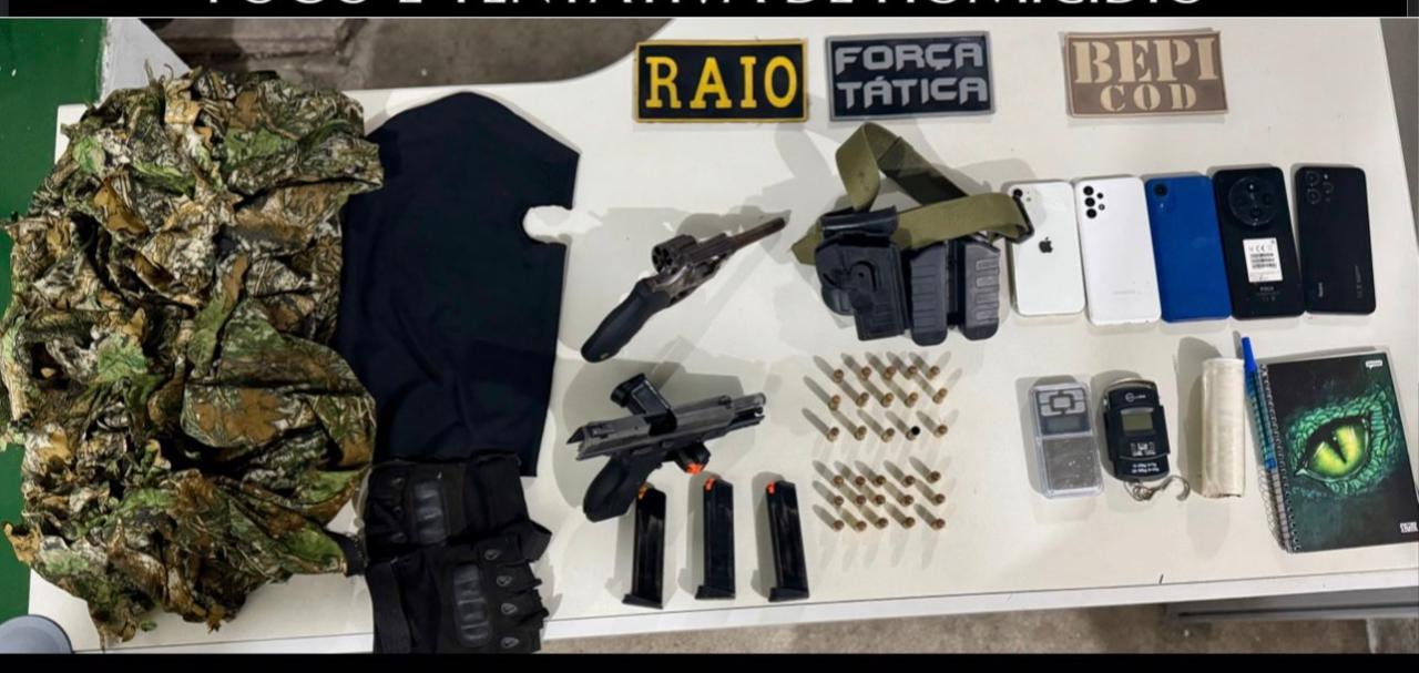 Com o apoio das equipes do Bepi e da Força Tática do 26º BPM, foi possível localizar e capturar dois suspeitos, um de 19 anos e outro de 26 anos. Um deles foi encontrado ferido dentro de um imóvel, sendo prontamente socorrido para atendimento médico, enquanto o outro foi localizado em uma residência próxima. Durante as buscas, os policiais encontraram uma pistola calibre .40 municiada, um revólver calibre .38, além de munições e diversos objetos possivelmente relacionados à prática criminosa.