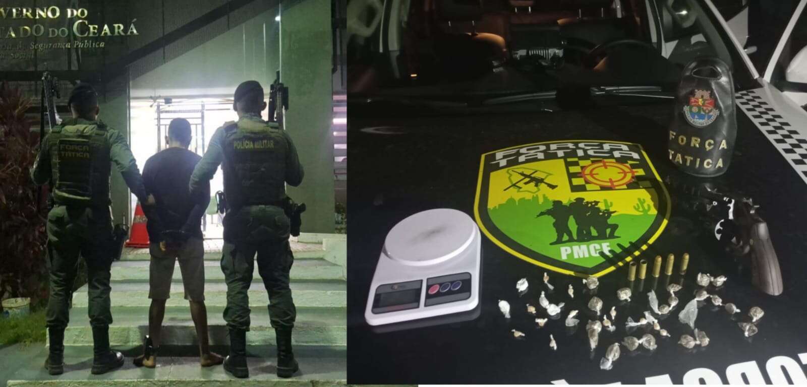 Durante a abordagem, o suspeito confessou que havia entorpecentes no interior da residência. Em diligência no local, os policiais apreenderam um revólver calibre .38, munições intactas e deflagradas, além de uma balança de precisão e diversas porções de maconha, cocaína e crack, prontas para comercialização.