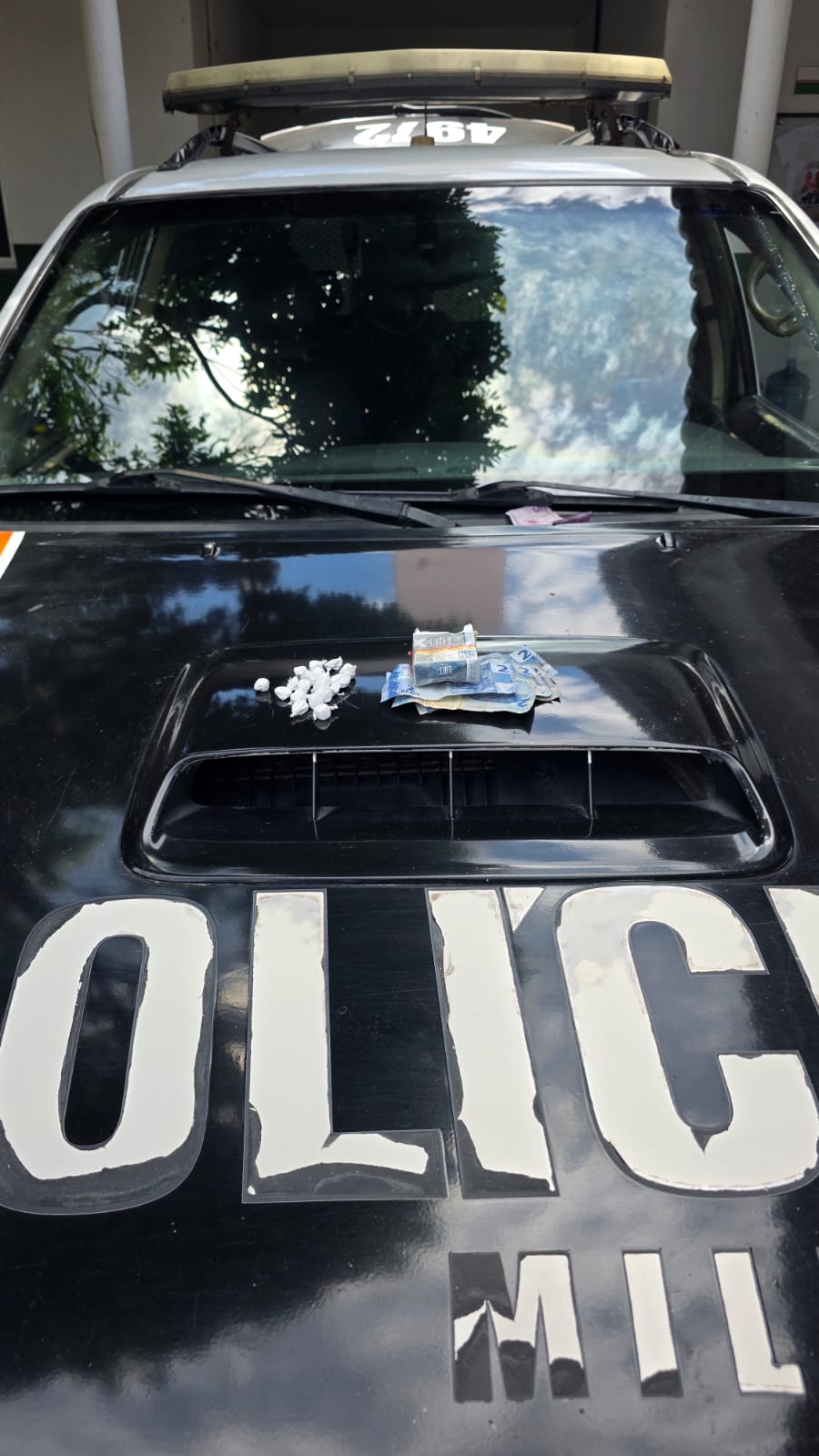 Por volta das 10h30, os policiais visualizaram dois indivíduos em frente a um estabelecimento comercial. Ao perceber a aproximação da viatura, um deles demonstrou nervosismo e tentou se afastar do local, sendo imediatamente interceptado. Durante a abordagem, os militares encontraram com o suspeito uma carteira de cigarros contendo papelotes de substância análoga à cocaína, além de uma quantia em dinheiro.