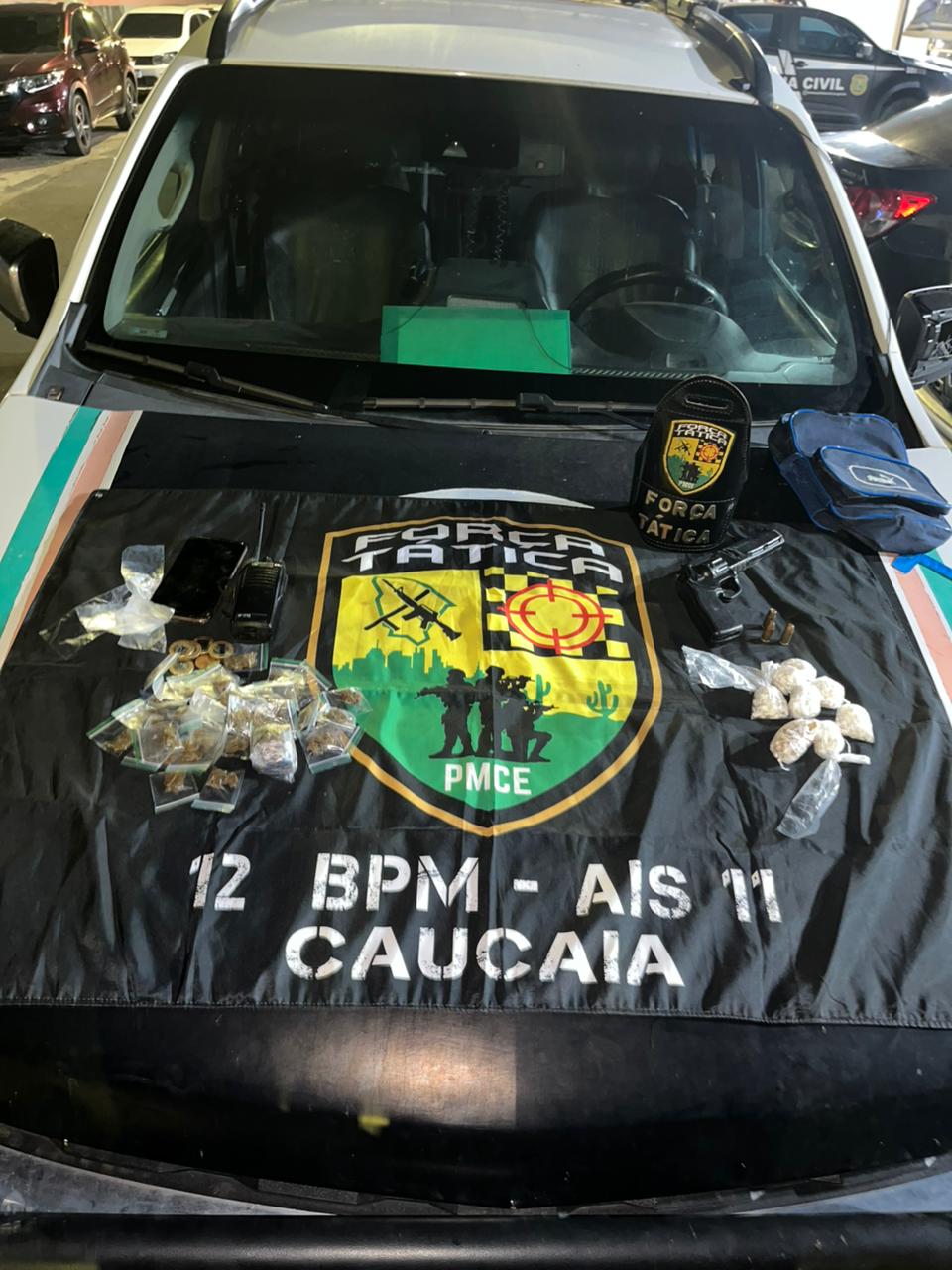 Uma equipe da 1ª Companhia do 12º Batalhão da Polícia Militar do Ceará (PMCE) prendeu uma mulher por tráfico de drogas na noite dessa segunda-feira (5), no bairro Nova Cigana, em Caucaia. A ação ocorreu após informações repassadas pela Subagência de Inteligência (SAI) da unidade e resultou na apreensão de entorpecentes, munições, um simulacro de revólver, dinheiro e um aparelho celular.