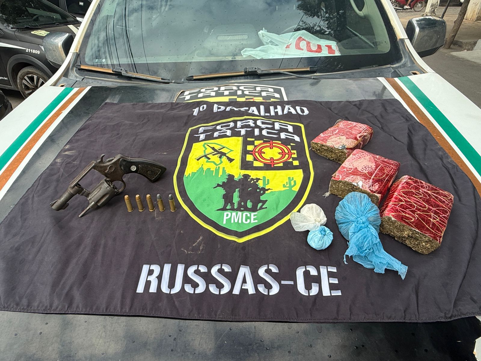 Uma arma de fogo e mais de 1kg de entorpecentes foram apreendidos pela Polícia Militar do Ceará (PMCE), por meio de equipes da Força Tática do 1º Batalhão de Polícia Militar (1º BPM), na tarde desta terça-feira (7), na localidade do Brejo, no bairro Mutirão, no município de Russas.