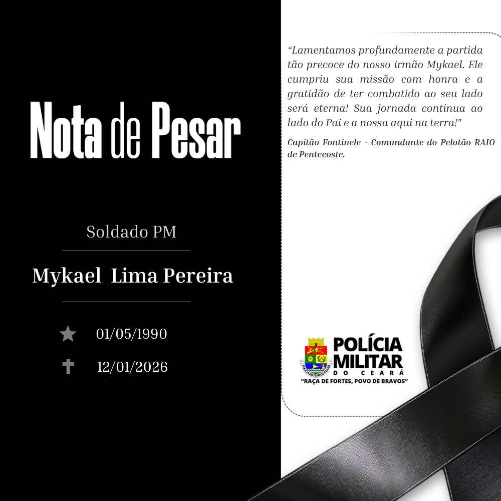 A Polícia Militar do Ceará (PMCE) informa com pesar o falecimento do Soldado PM MYKAEL LIMA PEREIRA, 35, nesta segunda-feira (12).