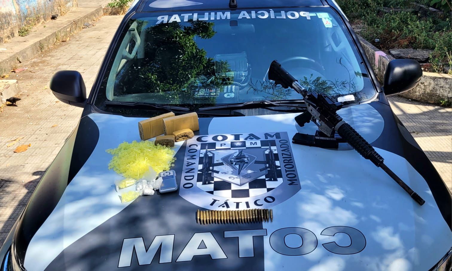 Durante as buscas, em um primeiro ponto, foi localizado um fuzil de calibre 5,56, acompanhado de dois carregadores e 26 munições intactas. Em outro local, o material estava enterrado e acondicionado em um recipiente plástico, sendo encontrados dois tabletes de maconha e 26 pinos de cocaína, além de uma balança de precisão e aproximadamente 150 pinos vazios utilizados para acondicionamento de drogas.