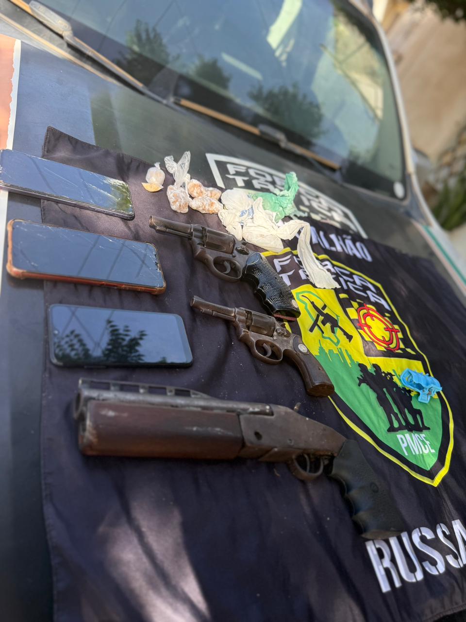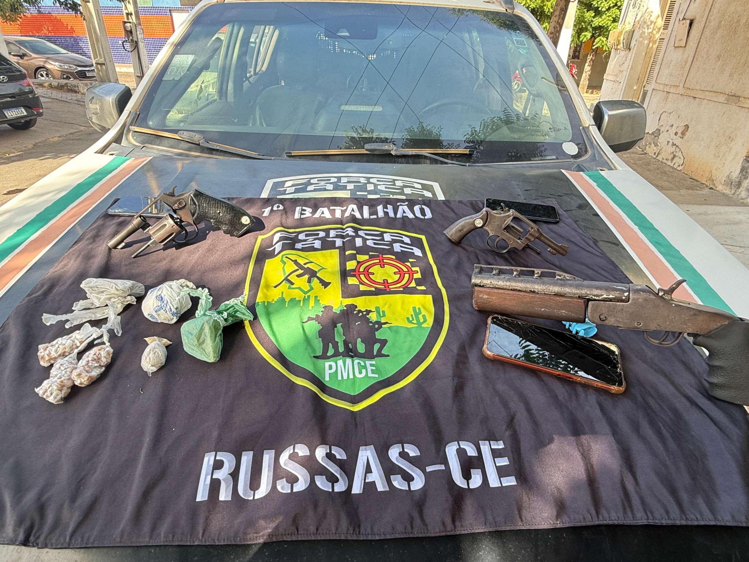 A Polícia Militar do Ceará (PMCE), por meio de equipes da Força Tática do 1º Batalhão, prendeu dois homens, de 29 e 35 anos, e apreendeu um adolescente de 12 anos, durante uma ação realizada na tarde dessa quinta-feira (15), no bairro Centro, em Russas. A ocorrência resultou na apreensão de armas de fogo e entorpecentes.
